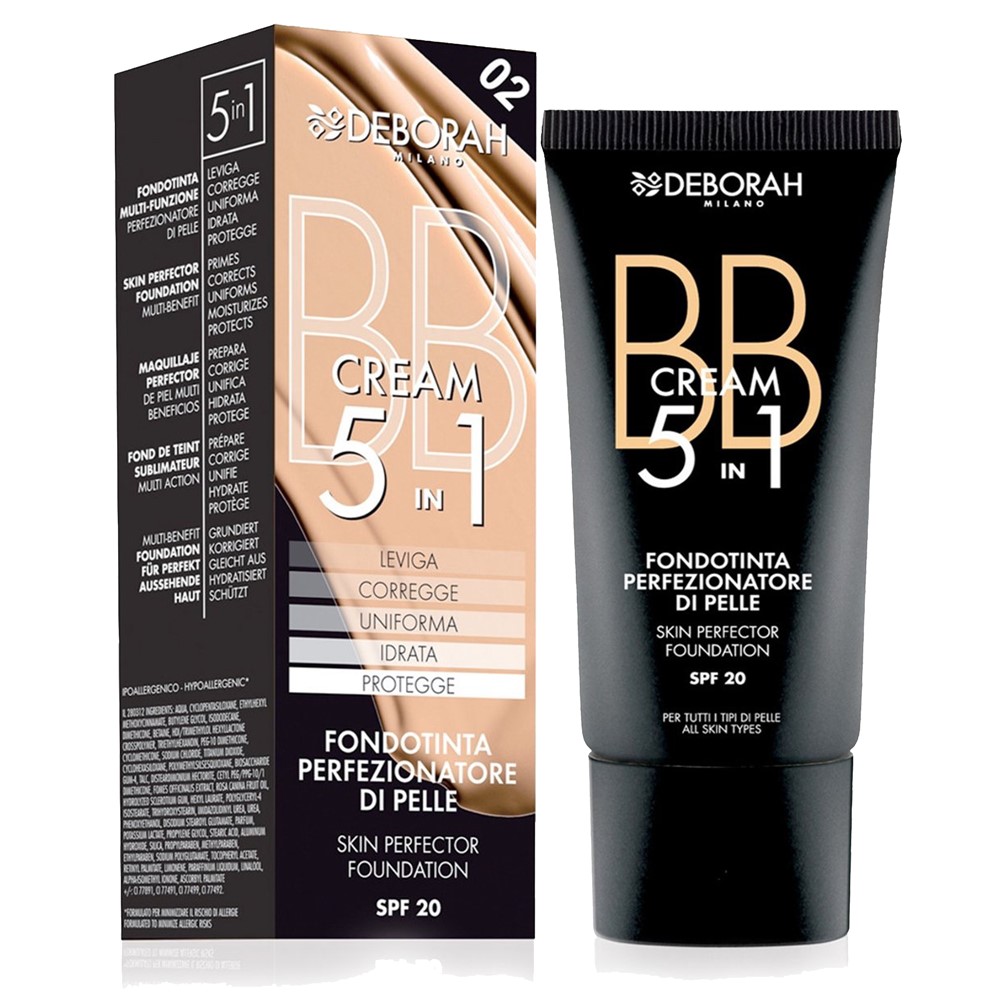 Fondatinë e lëngshme 5 në 1 për makeup, 02 Beige, në ngjyrë bezhë, me një formulë të testuar dermatologjikisht, me faktor të mbrojtjes ndaj rrezeve të diellit prej 20 SPF. Përdoret: