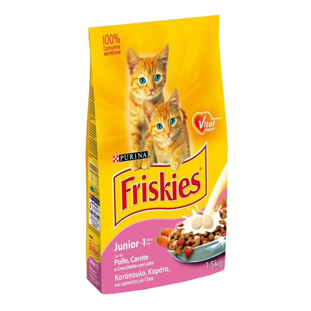 Friskies Kittens është një recetë e plotë dhe e ekuilibruar e përgatitur me mish dhe drithëra të pasura me proteina, e cila është formuluar posaçërisht për rritjen korrekte të koteles suaj.