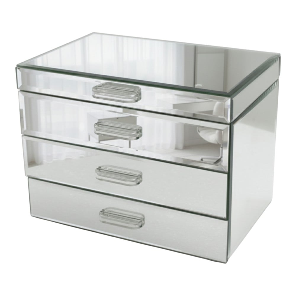 Organizoni bizhuteritë tuaja me stil dhe elegancë me këtë kuti magazinimi prej rezine dhe xhami me efekt pasqyre. E dizajnuar në ngjyrë gri, kjo kuti është më shumë se një zgjidhje praktike, është gjithashtu dhe një aksesor dekorativ që shton hijeshi në çdo komodinë, tavolinë apo raft. Me përmasa 24x16x18 cm, ofron hapësirë të bollshme për unaza, varëse, vathë apo aksesorë të tjerë, duke i mbajtur ata të organizuar dhe lehtësisht të aksesueshëm. Struktura e kombinuar e rezinës së qëndrueshme dhe xhami reflektues krijon një efekt modern e luksoz, që pasqyron dritën dhe shton ndriçim në hapësirë.