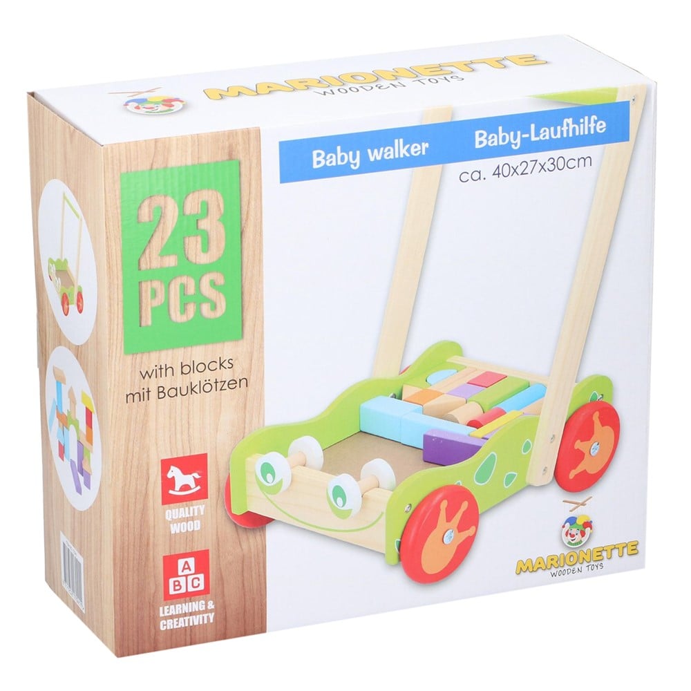 Lodër për fëmijë, e pajisur me një bosht prej materiali druri, e cila ndihmon fëmijët e vegjël që të mësojnë të ecin, duke nxitur kuriozitetin e tyre. Kjo lodër ndihmon në zhvillimin e aftësive motorike dhe stimulon zhvillimin e aftësive konceptuale dhe aftësive perceptuese taktile (të prekjes) dhe vizuale (të shikimit) tek fëmijët. Materiali përbërës dhe boja nuk kanë përmbajtje toksike apo të dëmshme për fëmijët dhe produkti është i çertifikuar për siguri në përdorim. Ky produkt është i përshtatshëm për përdorim nga fëmijë të moshës 1-3 vjeç.