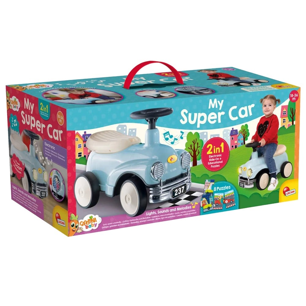 Një makinë fëmijësh e dizajnuar bukur për t'u argëtuar dhe eksploruar. Makina Carotina Baby – My Super Car është një lodër 2 në 1 që kombinon argëtimin dhe zhvillimin motorik për fëmijët nga 18 deri në 36 muaj. Me dizajn dhe material të qëndrueshëm, kjo lodër ndihmon në zhvillimin e ekuilibrit, koordinimit dhe vetëbesimit të fëmijës.Funksionon me 3 bateri X AA (nuk përfshihen në paketim) për muzikën dhe dritat.