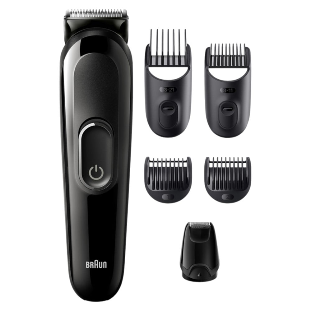 Makinë rroje 6-në-1 i Braun-it për rregullimin e mjekrës dhe flokëve: mjete të kuruara për prerjen e mjekrës, rruajtje me saktësi dhe prerje flokësh nga shtëpia. Stili juaj, pa mundim: tehu ultra i mprehtë është efikas në çdo goditje, madje edhe në zona të ndërlikuara për përfundime të shkëlqyera dhe rregullim të rehatshëm në të gjithë trupin. Stiloni lehtësisht, pa marrë parasysh gjatësinë: rezultate të shkëlqyera në çdo gjatësi floku me krehër fiks 1mm dhe krehje rrëshqitëse të mjekrës (3 - 21mm), me krehje fikse 1 mm & 2mm dhe krehër rrëshqitës të mjekrës (3 - 11 mm). Gati për t'u përdorur: ky komplet kujdesi për meshkuj ka një bateri të fuqishme Ni-MH me një kohë pune 50-minutëshe pa tel. Pastroni me lehtësi: pajisja ka koka dhe krehër të larë plus një furçë pastrimi.