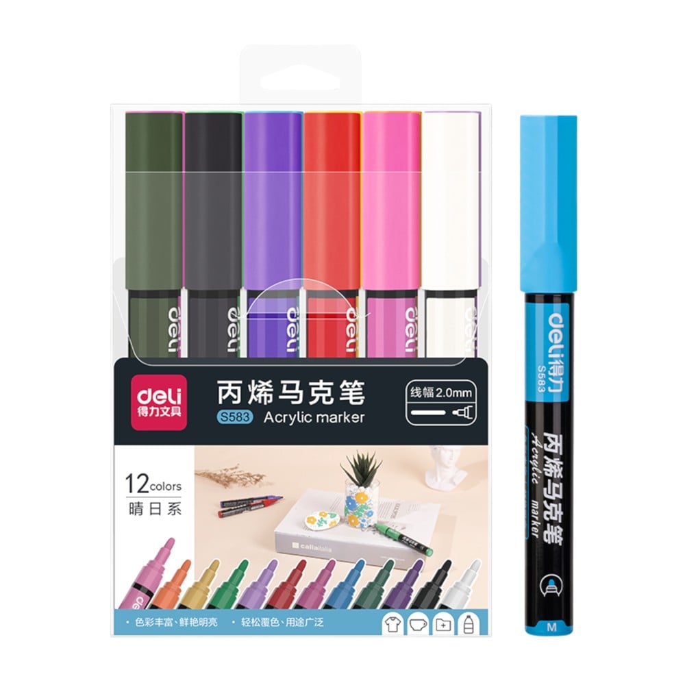 Ky set me 12 markerë akrilik nga Deli është ideal për vizatime, art dhe punime kreative. Ngjyrat e gjalla dhe të qëndrueshme ofrojnë një mbulim të mirë dhe rezistencë gjatë përdorimit. Markerët janë të lehtë për t’u përdorur dhe përshtaten për sipërfaqe të ndryshme si letër, karton, druri apo metali. Seti është i përshtatshëm për fëmijë, nxënës dhe artistë të vegjël që duan të shprehin kreativitetin e tyre.