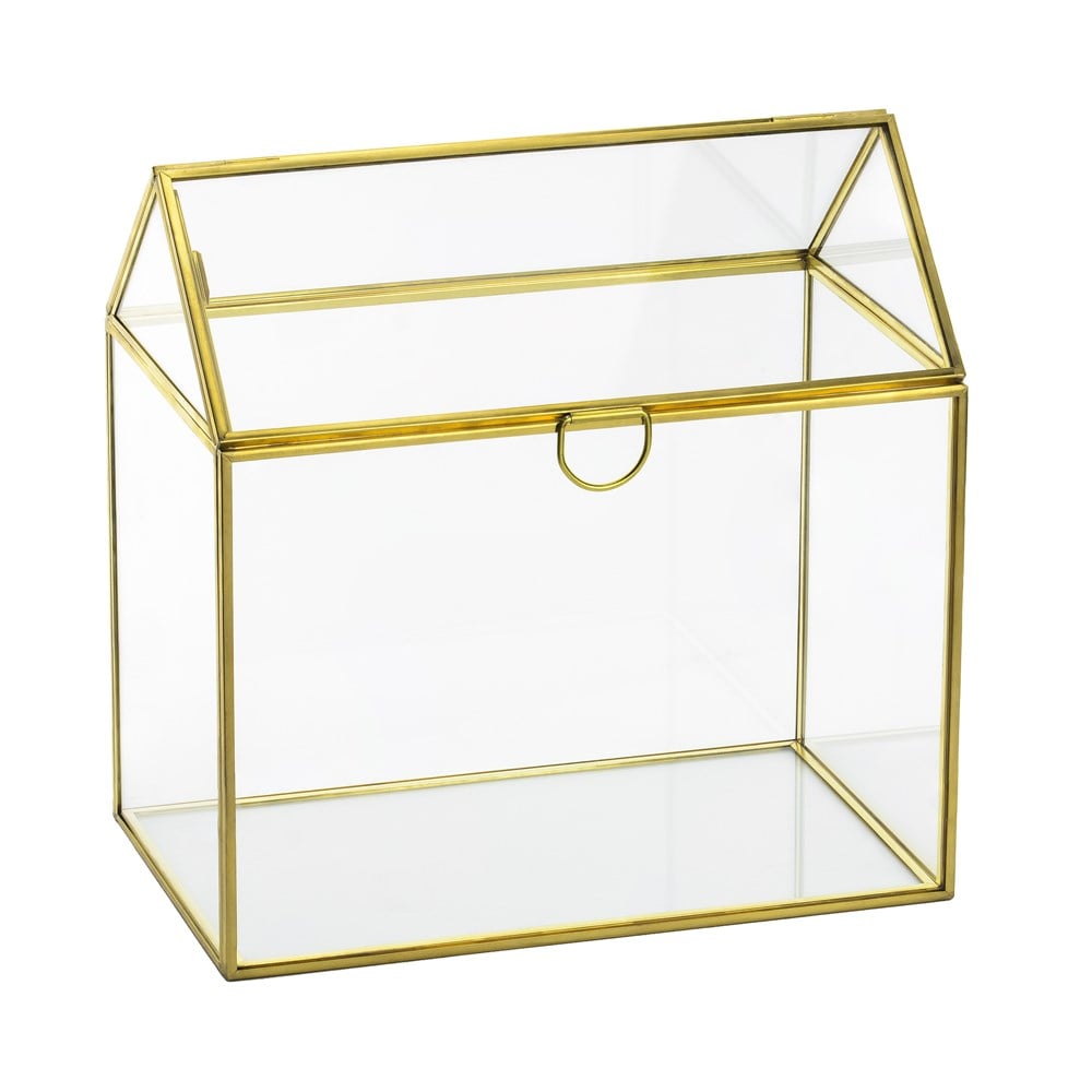 Mbajtës i kartave për dhurata I bërë në material qelqi në formë shtëpie me skajet metalike prej ari, madhësia përafërsisht. 13x21x21 cm. E përshtatshme për tu përdorur për dasma, festa, etj.