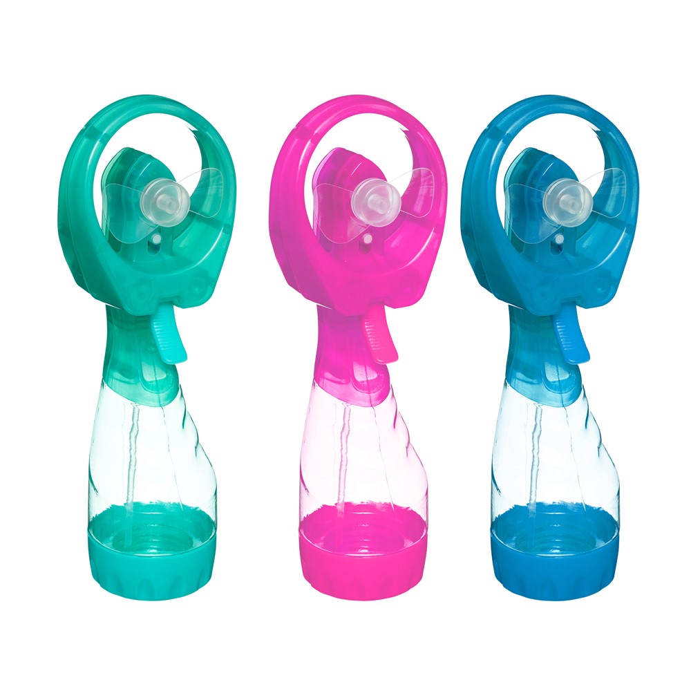 Ky mini ventilator me ujë i pajisur me një pajisje mjegulluese do të jetë ideal për t'ju freskuar në ditët e nxehëta te verës. Thjesht mbushni ventilator me ujë, rrokullisni atë dhe tërhiqni këmbëzën, dhe ventilatori do ta kthejë rrjedhën e ujit në pika të imëta. Eshtë i disponueshëm në 3 ngjyra: blu, rozë ose jeshile. Punon me 2 bateri LR6 - AA dhe ka nje kapacitet prej 25 cl.