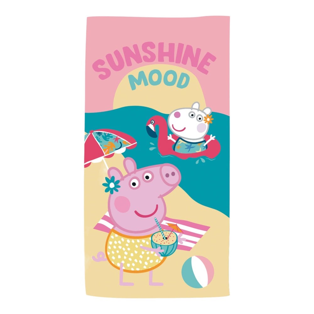 Peshqir plazhi për fëmijë me dizenjo Peppa Pig. Me dimensione 70x140 cm dhe i bërë nga mikrofibra e lehtë, ky peshqir ofron një kombinim të shkëlqyeshëm të komoditetit dhe absorbencës së shkëlqyeshme. Pamja e peshqirit është e pasuruar me ngjyrat karakteristike të Peppa Pig, duke e bërë atë një zgjedhje të përshtatshme për fëmijët që adhurojnë këtë personazh. Ky peshqir është ideal për plazh ose për përdorim në pishinë.