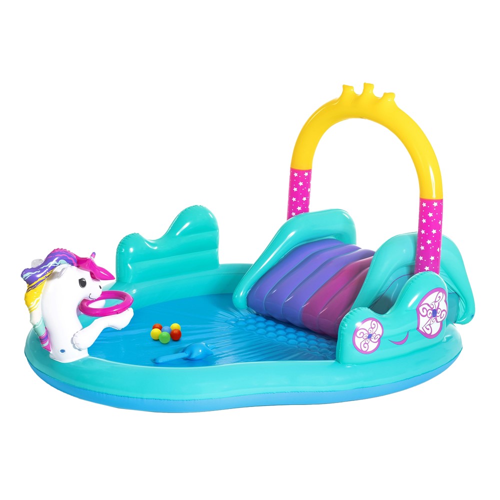 Pishinë e vogël me rrëshqitëse dhe lojë Unicorn me topa, për fëmijë, në formë ovale, prej materiali kloruri polivinili (PVC), me trashësi prej 0.27 mm, të përforcuar dhe të testuar paraprakisht, që e bën të qëndrueshme ndaj rrezeve të diellit, temperaturave të ftohta dhe gurëve apo objekteve të tjera të mprehta. Baza dhe muret anësore mund të fryhen me ajër, gjë që parandalon lëndimin e fëmijëve gjatë lojës. Pishina përdoret si një mënyrë për argëtimin e fëmijëve, është praktike në përdorim, nuk zë shumë hapësirë dhe është e përshtatshme për t'u vendosur në ambiente të jashtme. Pastrohet lehtësisht nëpërmjet një valvule kullimi të vendosur në bazën e pishinës. Pishina ka përmasa 274x198x137 cm dhe kapacitet mbajtës të ujit prej 220 litrash. Mund të montohet dhe çmontohet lehtësisht për vetëm 30 minuta, duke përdorur një pompë ajri. Seti gjithashtu përmban: