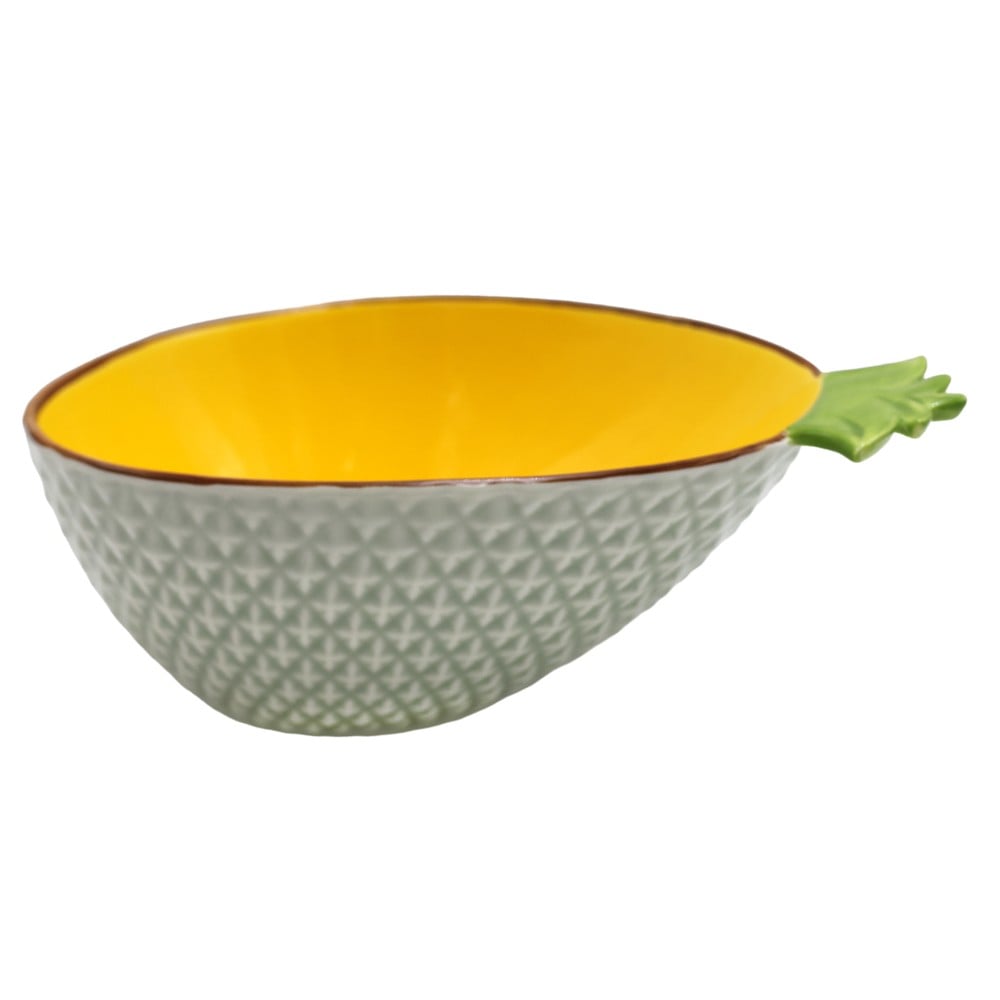 Pjatë formë ananasi, e prodhuar nga qeramika dhe në ngjyrën e verdhë, ka dimensionet 20.5x14.5 cm. Kjo pjatë ka një dizajn të veçantë me formën e një ananasit, duke e bërë atë një shtesë tërheqëse për dekorin e tavolinës ose ambientin e shtëpisë. Ngjyra e verdhë i jep një prekje të freskët dhe të gëzueshme, duke e bërë atë të përshtatshme për raste festive ose për përdorim të përditshëm. Materialet e qeramikës e bëjnë atë të qëndrueshme dhe të përshtatshme për përdorim të përditshëm.