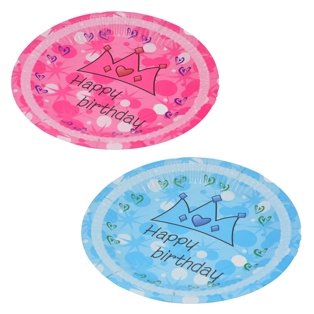Pjata me dekor Happy Birthday, prej materiali kartoni, në ngjyrë blu ose roze. Përdoren në evente të ndryshme si festa, ditëlindje etj. për të servirur ushqimin, duke shmangur rrëmujën dhe enët e papastra. Materiali është higjienik dhe i certifikuar për sigurinë ndaj ushqimit. Ky produkt është praktik dhe i thjeshtë në përdorim.
