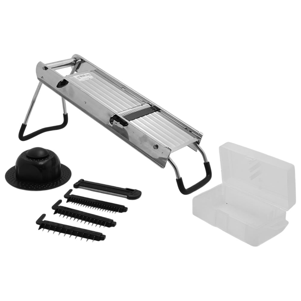 Kjo prerëse perimesh "Mandoline", e bërë nga inoks 18/10 cilësor dhe polipropilen i qëndrueshëm, me një dizajn elegant argjendi dhe të zi, ofron një mënyrë të shpejtë, të sigurt dhe të precizuar për të prerë perime, fruta dhe ushqime të tjera. Dizajni i saj i fortë dhe tehet e mprehta sigurojnë prerje të barabarta dhe të pastra, duke e bërë atë një mjet të domosdoshëm për çdo kuzhinë. Ideale për prerjen e perimeve, frutave, patateve, djathrave dhe ushqimeve të tjera në feta, shirita ose kubikë. E përshtatshme për përdorim në kuzhina shtëpiake, restorante dhe ambiente të tjera.