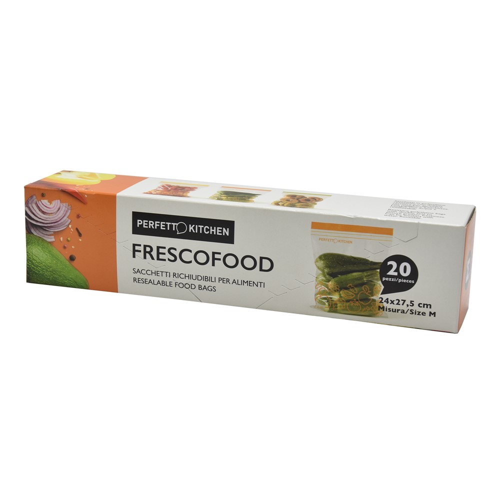 Qese për ruajtje ushqimesh, në madhësinë M, prej materiali plastik, me përmasa 24x27.5 cm, në ngjyrë transparente. Qesja është e pajisur me mbyllje hermetike dhe materiali përbërës ka veti higjienike dhe antibakteriale. Përdoret për ruajtjen në frigorifer të ushqimeve të ndryshme, duke ruajtur vetitë dhe shijen e ushqimit dhe duke parandaluar krijimin e aromave të pakëndshme. Ky produkt është i përshtatshëm për përdorim në ambiente shtëpie apo për ruajtjen e përbërësve të ndryshëm në kuzhina profesionale.