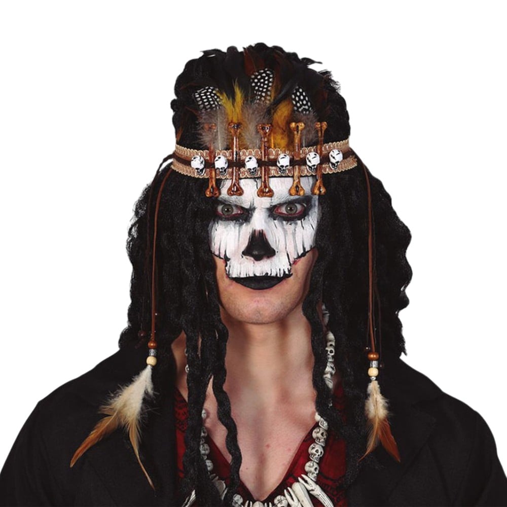 Shiriti i kokes me pupla vudu sigurisht që do të kompletojë kostumin tuaj vudu, në mënyrë që të jeni plotësisht gati dhe të frikshëm për Halloween. Ky shirit koke vudu është bërë nga poliestër me pupla, kocka dhe kafka.