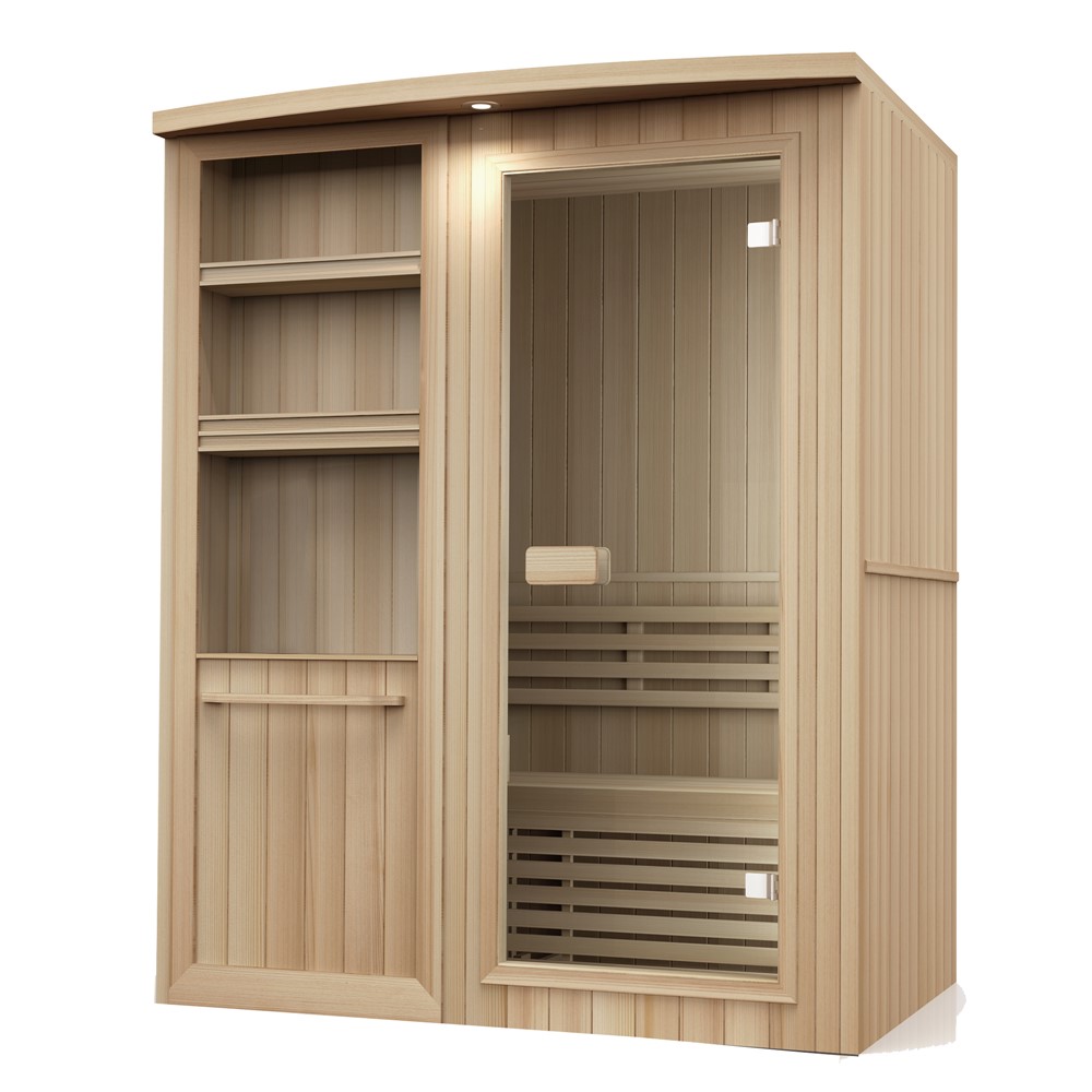 Sauna tradicionale ekskluzive dhe e ngrohtë. Këtu mund të shijoni shumë momente të shëndetshme dhe të këndshme në një mjedis komod. Sauna ofron një atmosferë të rehatshme dhe është në të njëjtën kohë një dekor i përsosur. Këtu kemi rafte të mira me hapësirë të bollshme, dhe jashtë saj ka një raft për të vendosur dhe verën apo cfarë doni të konsumoni. Sauna është një investim në shëndetin dhe cilësinë e jetës. Ul stresin dhe lodhjen, rrit qarkullimin e gjakut, lehtëson dhimbjen dhe ngurtësinë, jep lëkurë të butë, largon papastërtitë dhe qelizat e vdekura të lëkurës. E përsosur për 2 persona dhe i përshtatshëm për shtëpi, llixha, sallone bukurie dhe hotele. Në sauna ndodhet 1 stol, 1 kovë me lugë, guri saunës që peshon 10 kg.