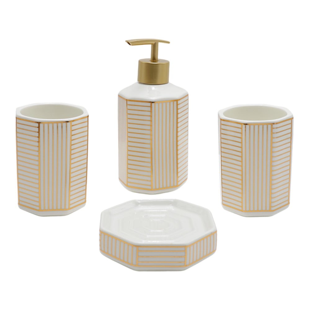 Set aksesorësh tualeti "Avril" ideuar në qeramikë të cilësisë së lartë në ngjyrë të bardhë dhe vijëzime ngjyrë floriri. Me formë drejtkëndore dhe linja të rregullta ky set praktik do i japë një pamje moderne banjës tuaj. Seti përbëhet nga një dispenser sapuni të lëngshëm, një mbajtëse sapuni, një mbajtëse furcesh dhe një mbajtëse pambuku.