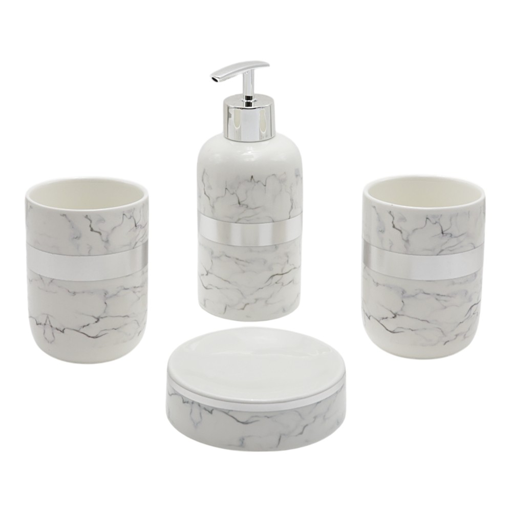 Set aksesorë tualeti, 4 copë, Marbrea, qeramikë, e bardhë, argjend
