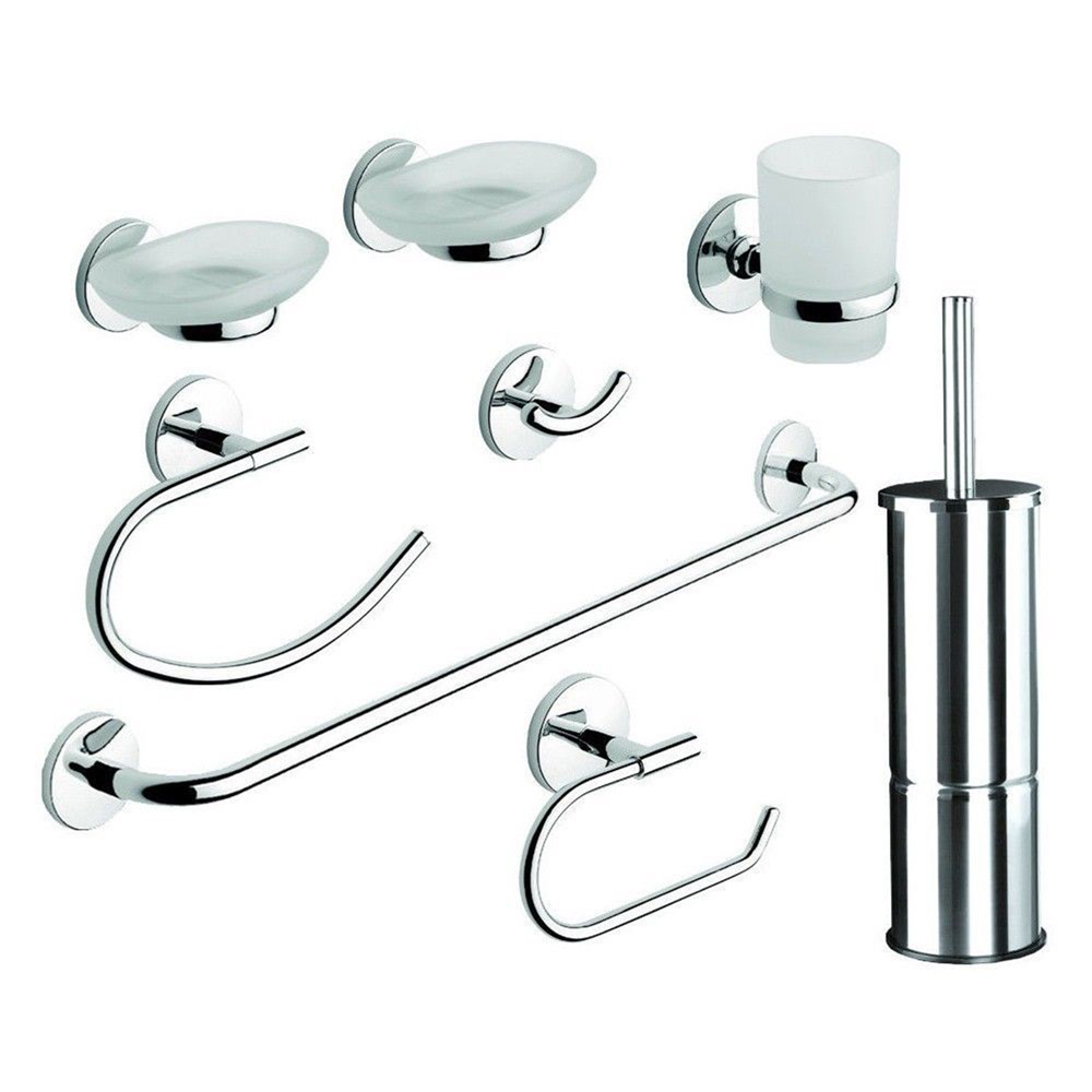 Shtojini elegancë dhe stil tualetit tuaj me setin e aksesorëve "One". Me tetë artikuj të ndryshëm praktikë dhe funksionalë, ju mund të krijoni kombinime të shkëlqyera për një ambient të personalizuar. Seti i aksesorëve të tualetit është një zgjidhje efikase për një shumëllojshmëri tualetesh. Materiali inoks mundëson jetëgjatësi shumë të lartë në përdorim. Dizajni plot stil dhe eleganca në formë e bëjnë këtë produkt të përshtatshëm për tualete bashkëkohore duke ju dhënë më tepër hijeshi këtyre ambienteve. Seti përmban 2 mbajtëse sapuni, 1 mbajtëse furçë dhëmbësh, 1 mbajtëse peshqiri 56 cm, 1 mbajtëse peshqiri të vogël, 1 varëse rrobash, 1 mbajtëse letre higjenike dhe 1 furçë tualeti.