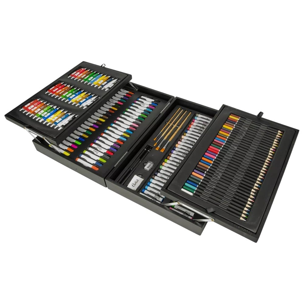 Ju mund të krijoni vepra mahnitëse arti me këtë set pikture prej 174 pjesësh të ruajtur në një kuti druri. Është një domosdoshmëri për skicuesit, artistët dhe stilistët e apasionuar. Është krejtësisht i përshtatshëm si për fillestarët ashtu edhe për artistët me përvojë. Kompleti përbëhet nga 174 vegla vizatimi dhe pikture si lapsa për ngjyrosje dhe grafiti, stilolapsa me majë, bojëra akrilike, bojëra uji dhe vaji. Seti përfshin gjithashtu katër penela (të rrumbullakëta dhe të sheshta), një gomë dhe një mprehës metalik.