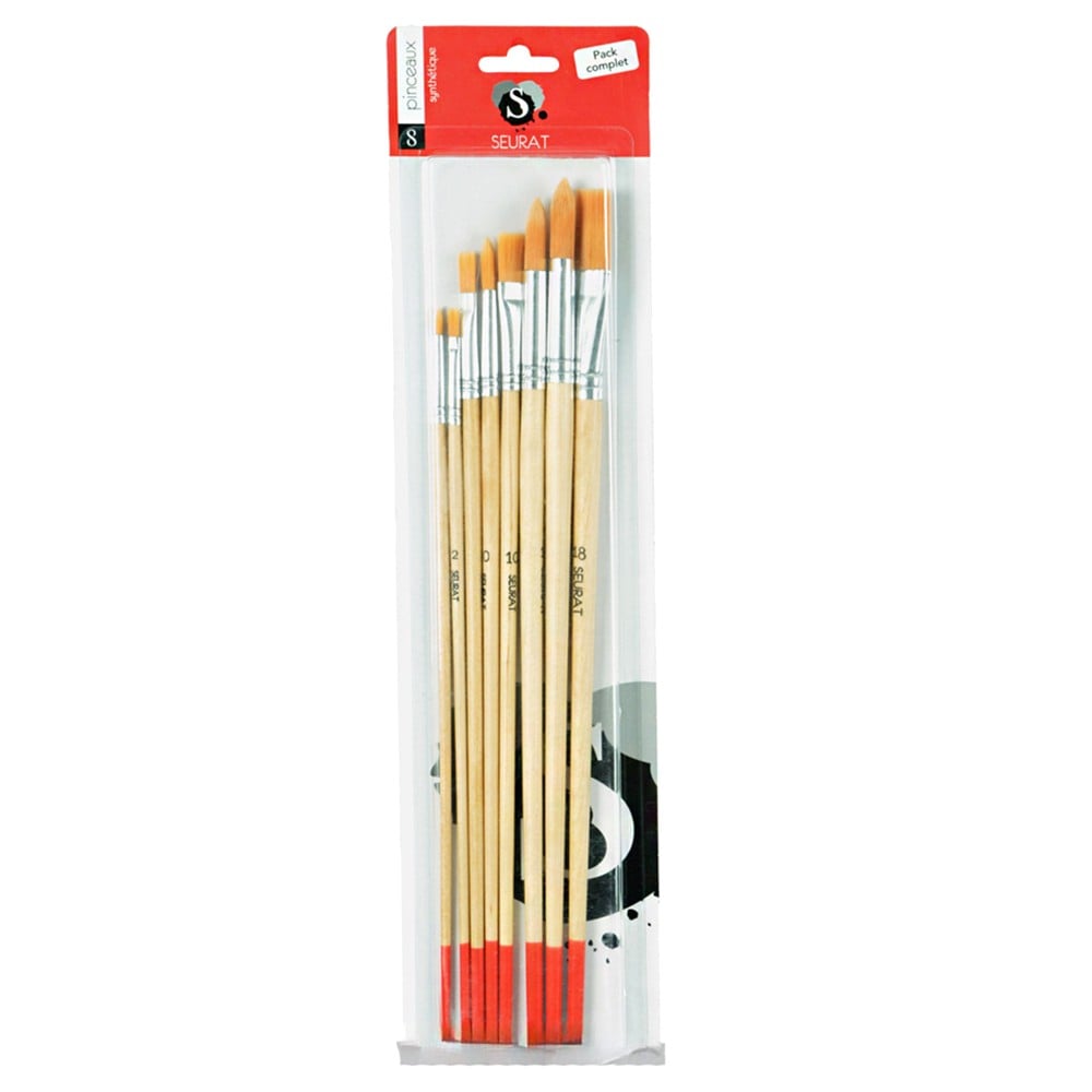 Set me penel për pikturë, Seurat, i përbërë nga tetë penela me gjatësi 31 cm dhe bisht druri. Përdoret për aplikimin e ngjyrave në teknika të ndryshme pikture si akrilik, akuarel apo tempera, duke ofruar precizion dhe kontroll gjatë punës artistike. Penelët janë të pajisur me fije sintetike rezistente dhe bisht ergonomik prej druri, që siguron komoditet gjatë përdorimit të zgjatur. Ky produkt është i përshtatshëm për përdorim profesional nga artistë dhe studentë arti, si dhe për përdorim jo-profesional nga amatorë dhe fëmijë të apasionuar pas pikturës.