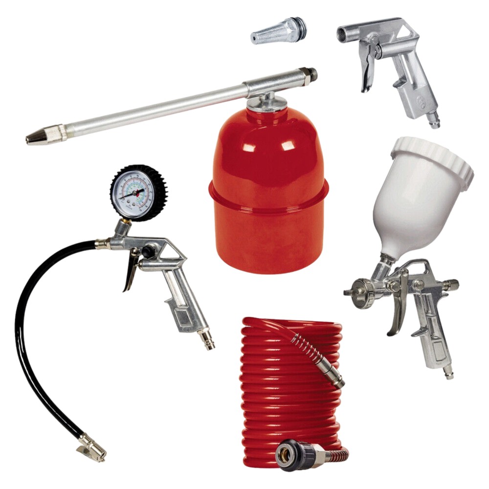 Set ideal per realizimin e projekteve tuaja DIY. Veglat fuqizohen nga ajri i presuar. Pistoleta e lyerjes, ben te lehte lyerjen e siperfaqeve metalike dhe druri. Pistoleta e pastrimit me solucion mund te perdoret per heqjen e papastertive dhe grasos. Fryresi i gomave me manometer, ben te sigurte fryrjen sipas standartit. Pistoleta e fryrjes me ajer, pastron mekanizmat edhe ne pozicionet me te veshtire. Seti shoqerohet nga tubi 4 m.