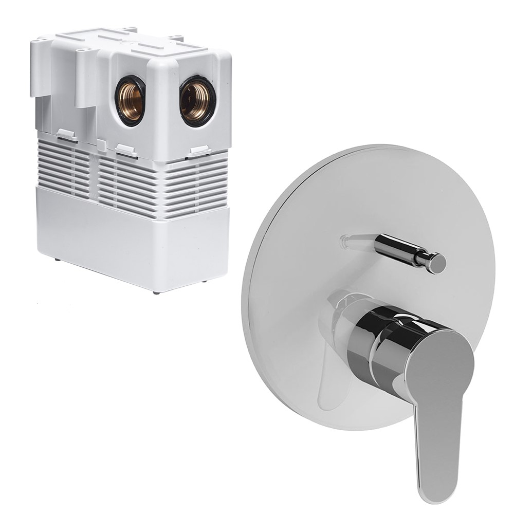 Njësia e instalimit të fshehur Vitra është e përshtatshme për dy priza. Instalohet në mur në mënyrë që të mund të përdoret një montim i hollë i fshehur në banjën e përfunduar. Thellësia e instalimit mund të arrihet midis 65 dhe 95 mm. Fija lidhëse 1/2". Grupi që montohet në sipërfaqe është i përbërë nga leva, rozeta dhe diverter me bravë.