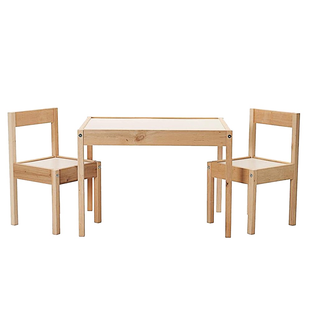 Set tavolinë dhe karrige për fëmijë, prej material druri dhe MDF. Ajo vjen në ngjyrë natyrale dhe të bardhë, me një përmasë prej 48.5x63x45 cm e tavolinës dhe 28x28x50 cm per secilën karrige. Seti pëermban një tavolinë dhe dy karrige.