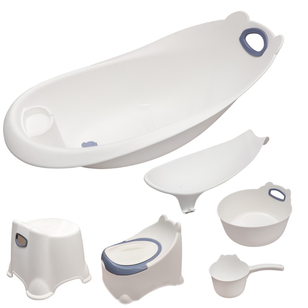 Vaskë për bebe në ngjyrë të bardhë. Forma e saj anatomike kontribuon në komoditetin dhe sigurinë e fëmijës. Vaska është set dhe ka të përfshirë aksesorët e duhur për dushin e fëmijës.