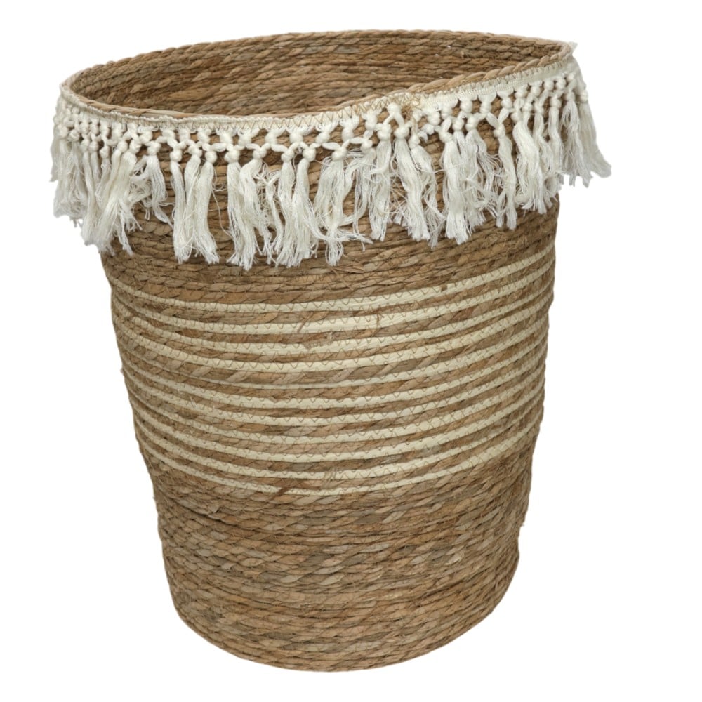 Stil dhe elegancë janë dy elementët që karakterizojë këtë shportë magazinimi e cila vjen në përmasat Ø38xH43 cm cm duke u përshtatur lehtësisht me hapësirat tuaja. Ju mund ti merrni ato si set duke organizuar sendet tuaja në mënyrë të përsosur, por edhe të zgjidhni ta përdorni ashtu si ju dëshironi. E punuar me kashtë dhe më një ndërthurje mes ngjyrave të bardhë dhe kafe natyrale, është zgjedhja ideale për adhuruesit e një stili minimalist me linja të pastra. Shporta ka një stil boho dhe kombinohet lehtësisht me ambiente të ndryshme. Ju mund ta përdorni atë në tualet për të organizuar sende të ndryshme të përdorimit vetjak, po ashtu edhe në dhomën tuaj të gjumit, pra mund të kenë opsione dhe alternativa të ndryshme përdorimi sipas nevojave tuaja.