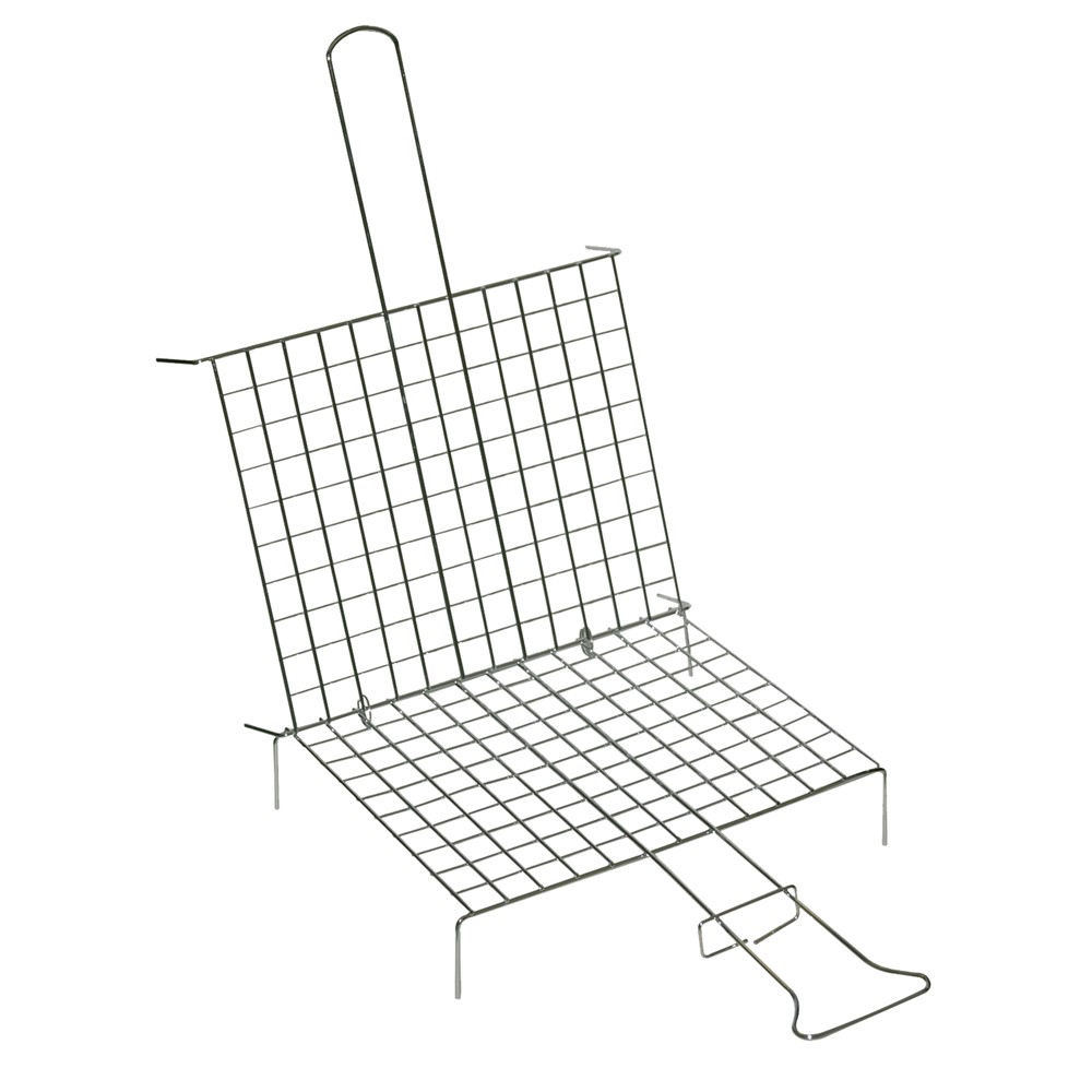 Grilë çeliku e kromuar me dorezë dhe me këmbë. Grila eshte e përshtatshme për tu përdorur ne furra zjarri Përmasa:24x30 cm