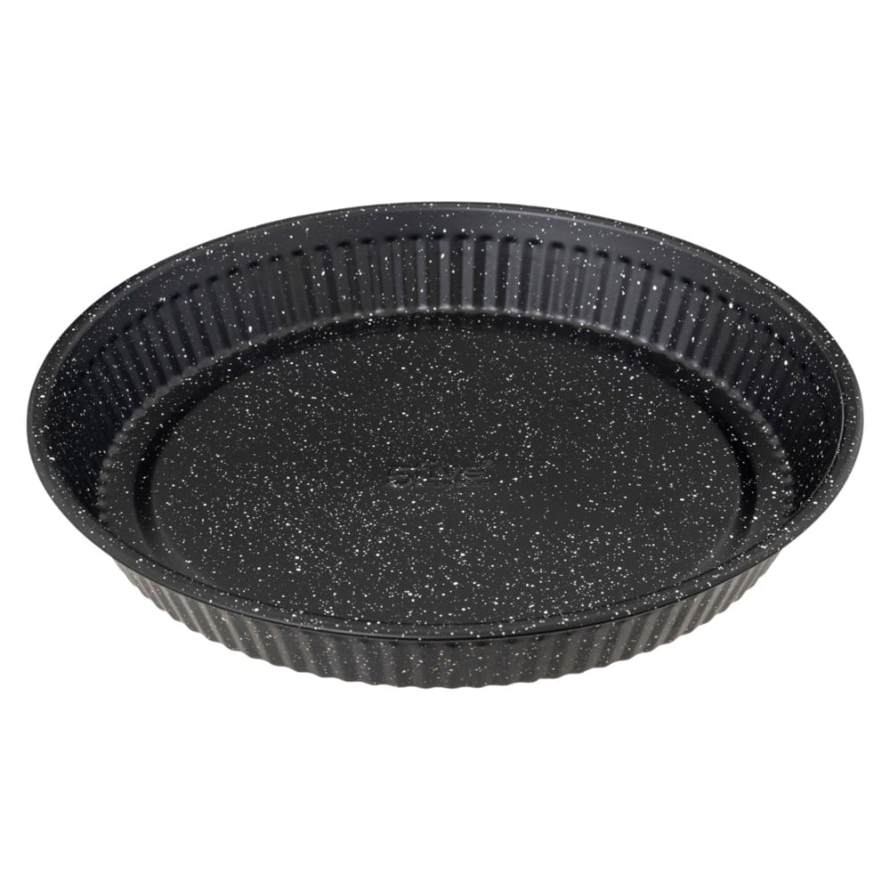 Stendë keku/torte i rrumbullakët në ngjyrë të zezë. Është bërë nga material metalik, i përshtatshëm për ushqim. Enë ideale për të bërë tortat më të shijshme.