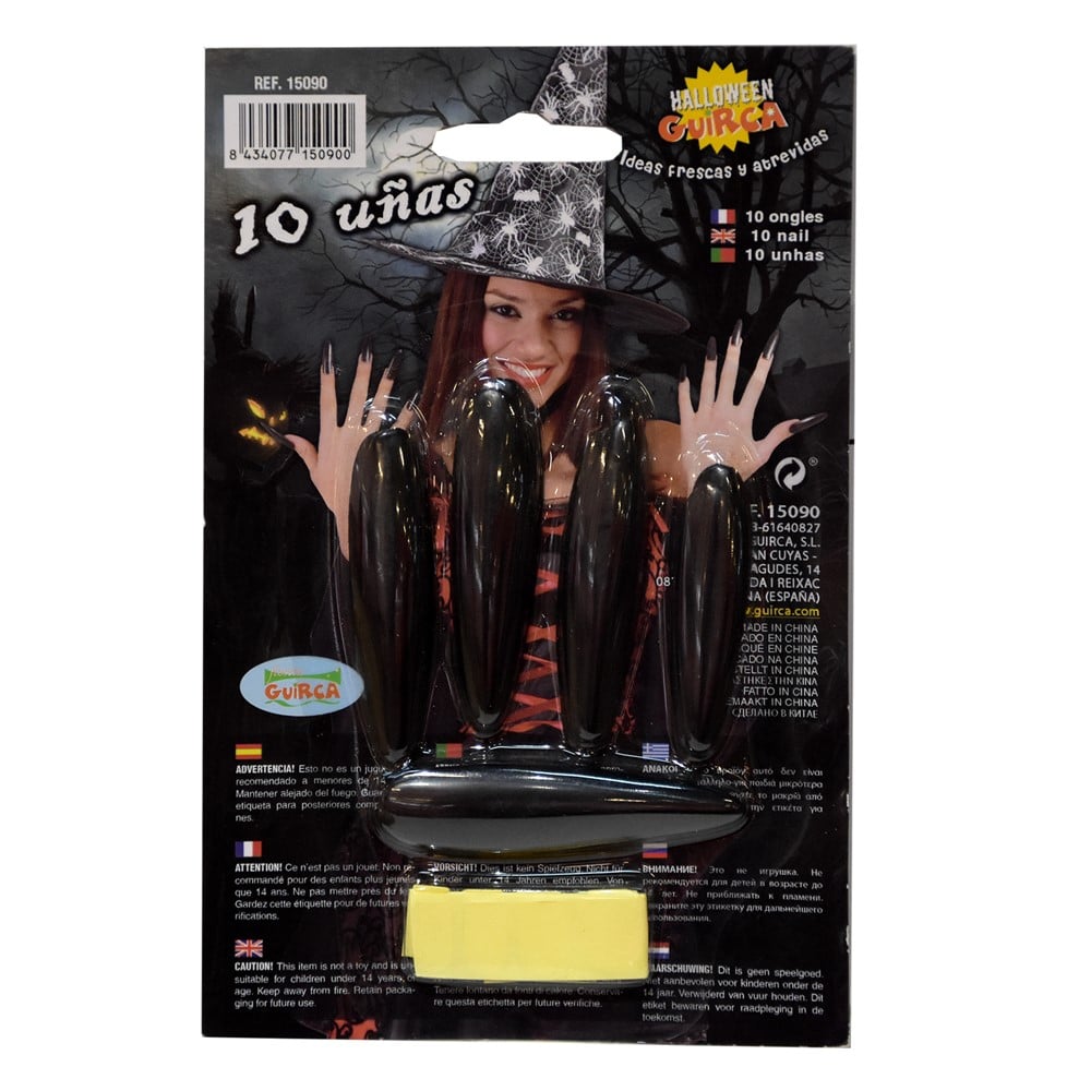 Blister me set prej 10 thonjsh ngjitës plastikë të zezë me ngjitës, të gjatë dhe të mprehtë, ideal për të plotësuar një kostum magjistare, gotike dhe vampiri.