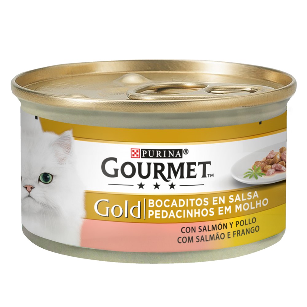 Ushqim per mace, Gourmet, Gold, 85 g, Salmon dhe pule, I koservuar