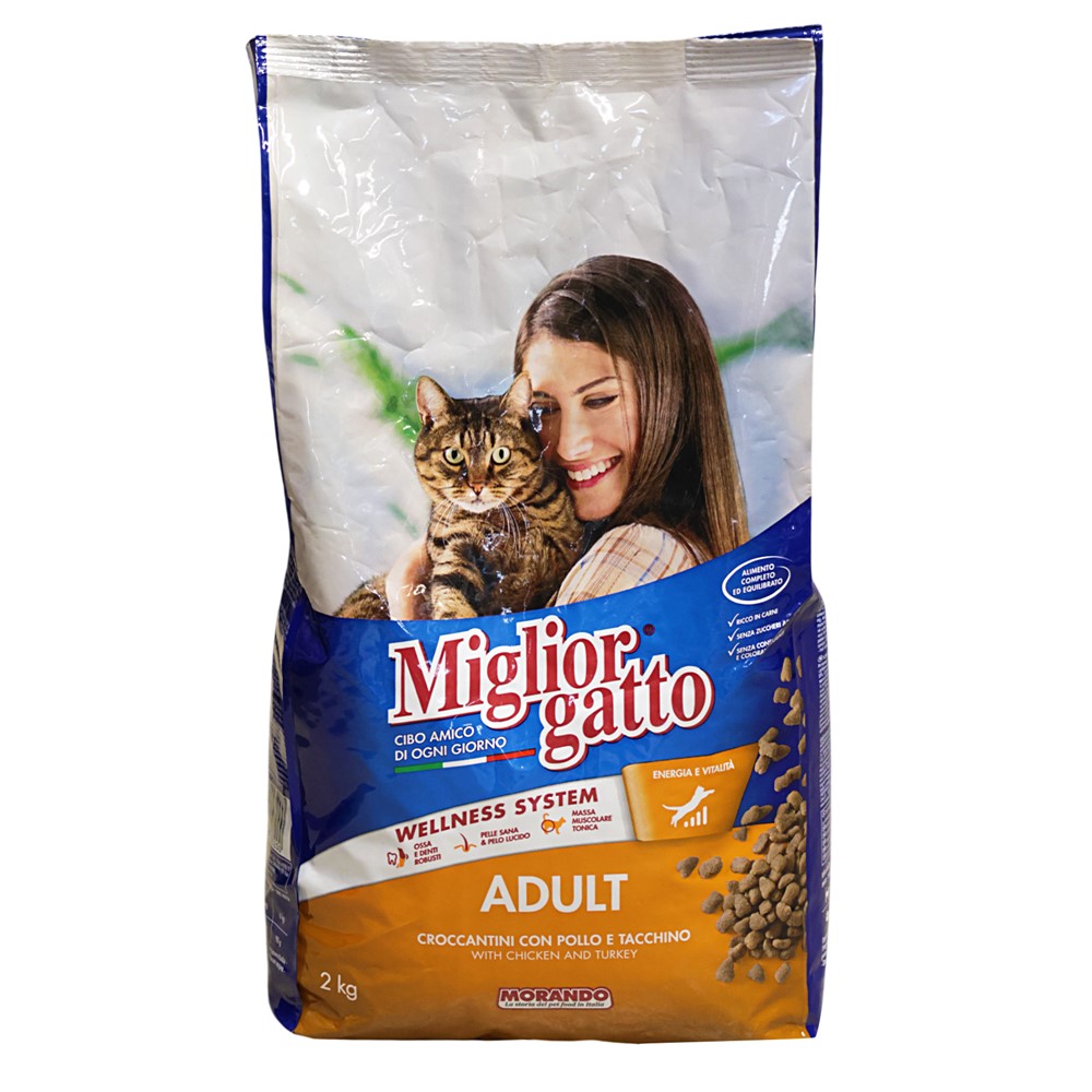 Ushqim për mace 2 kg. MIGLIORGATTO me mish pule dhe perime. Pasuruar me Omega 3 dhe 6. Drithëra, mishit dhe nenprodukteve të mishit (nga të cilat pule 4%, ), vajra dhe yndyrna, perime (karrota dehidratuar 4%), nënproduktet bimore, proteina, maja, minerale. Përbërësit analitike: lageshtira 10%, Vajra të papërpunuara dhe yndyrna 12.5%, Hi bruto 7.9%, proteinë e papërpunuar 30%, Fibër bruto 2%. Aditivëve ushqimore: Vitamina A 11000 U.I./ kg , Vitamina D3 900 U.I / kg , Vitamina E 85 mg/kg, Oksid zinku 60 mg / kg, Sulfat bakri pentahydrate 25 mg / kg, Jodur kalium 0.5 mg / kg, Selenite sodiumi 0.2 mg / kg. Produkti është gati për t'u përdorur. Te ruhet në një vend të freskët dhe të thatë, larg nga rrezet e diellit.