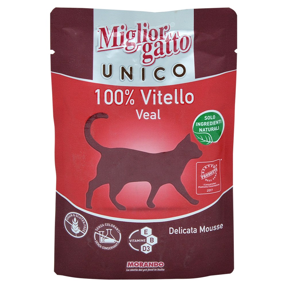 Migliorgatto Unico është një ushqim i plotë i përshtatshëm për të ushqyerit e përditshëm të të gjitha macet, të fituara me përbërës natyralë. Karakteristikat e tij kryesore duhet të jenë 100% e një burimi të vetëm proteina dhe të jenë të lirë nga drithërat. Kjo recete e bën atë produkt ideal për ata që duan të ruajnë mace e tyre nga efektet e ndonjë intolerance të ushqimit në mish që është ndryshe nga proshutat. Migliorgatto është unik për llojin e proteinës së përdorur, unike për shijen e saj, unike për freskinë dhe ushqimin që garanton.