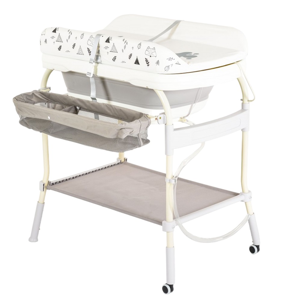 Vaske per bebe me mbajtese dhe nderruese, përshtatshme për fëmijë nga 0 m+ deri në 11 kg. Ka të vendosur një termometër dixhital me ngjyra. Treguesi i termometrit është me ngjyra sipas nxehtësisë së ujit. Blu - temperatura e ujit është shumë e ftohtë, jeshile - temperatura e ujit është e përshtatshme për të larë fëmijën, e kuqe - temperatura e ujit është shumë e nxehtë. Përfshihet tavolina e ndërrimit. Shporta e ruajtjes e palosshme. Tub kullimi uji. Këmbë mbështetëse të rregullueshme në 3 pozicione. 2 rrota dhe 2 ndalesa për lëvizje të lehtë. Raft i fiksuar nën vaskë.