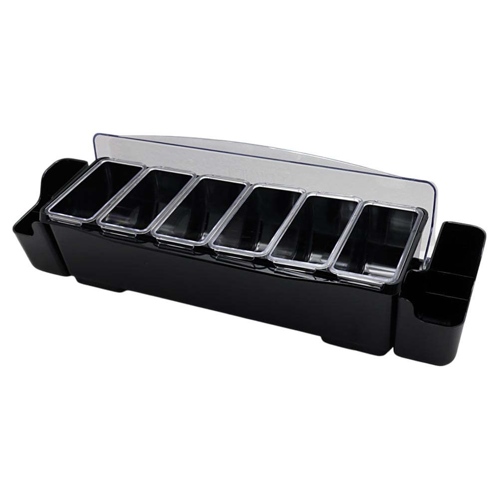 Kjo vasketë e zezë, e ndërtuar nga kombinimi i materialeve PC (polikarbonat) dhe ABS (akrilonitril butadien stiren), është një organizues i avancuar për shërbimin e barit ose tavolinës, që ofron 6 ndarje të veçanta dhe 2 mbajtëse shtesë. Dizajni i saj i integruar ndihmon në organizimin e aksesorëve të ndryshëm, duke siguruar një shërbim efikas dhe të pastër. Ideale për përdorim në bare, restorante, kafene dhe ambiente të tjera shërbimi ushqimi. Përdoret për të mbajtur aksesorët e nevojshëm për pije, ushqime, ose për të mbajtur salca.